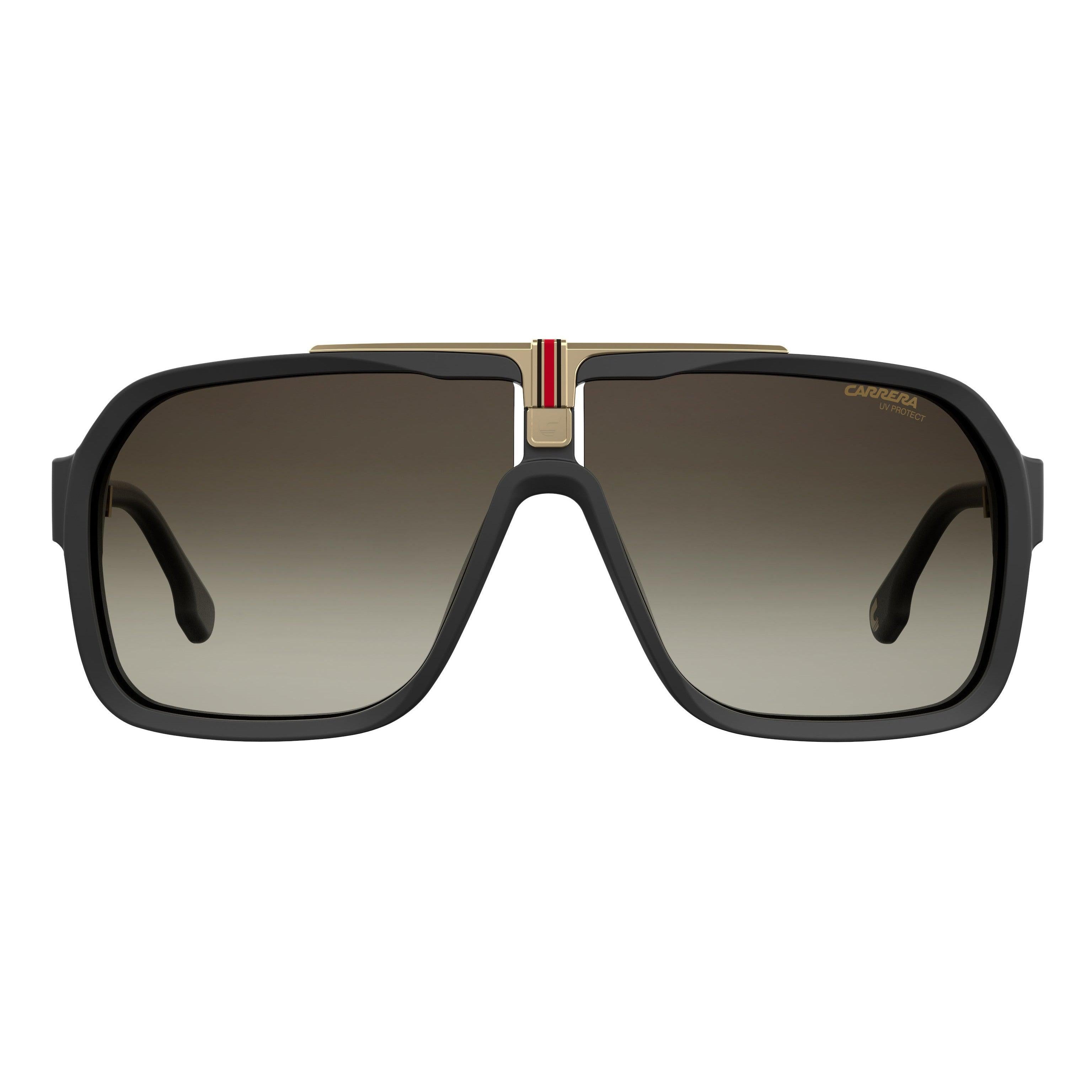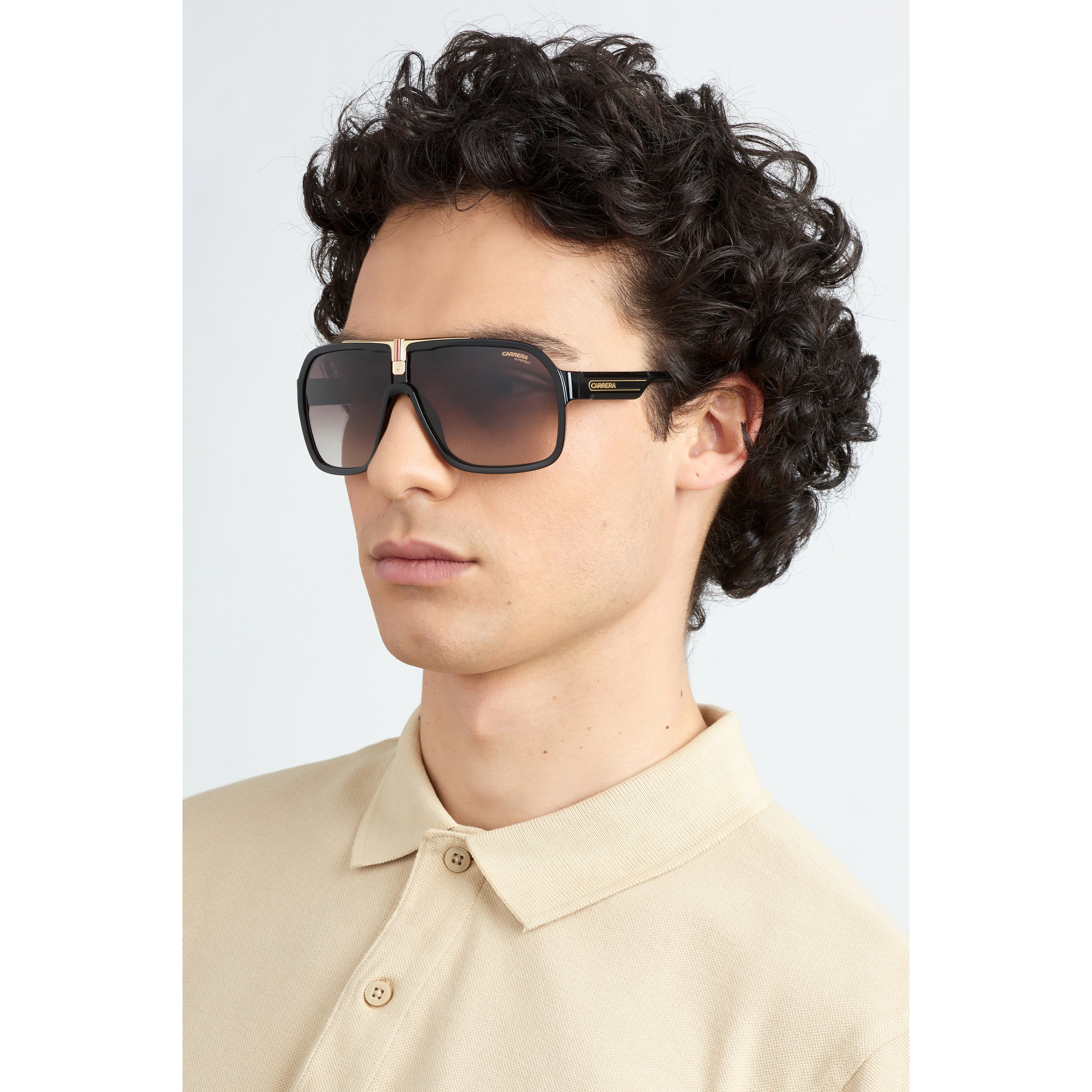 These navigator sunglasses infuse Carrera's sport-style spirit and retro appeal with a dose of urban attitude — perfect for men who want to be spotted on the streets. The neat square silhouette features an injected plastic front and temples and comes complete with UV-protective polycarbonate lenses to shield your eyes from harmful rays. Notice the label’s logo engraved in low relief on each temple, the famous Flag motif printed in high relief front and centre and the C-logo positioned discreetly inside the left end-tip — Carrera’s covetable signatures.